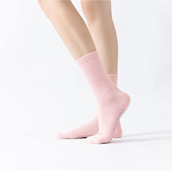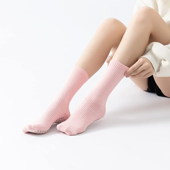 Yoga Pilates Socks with Grips for Women Non Slip Solid Colored Cushioned Crew Compression Socks for Barre Ballet Dance