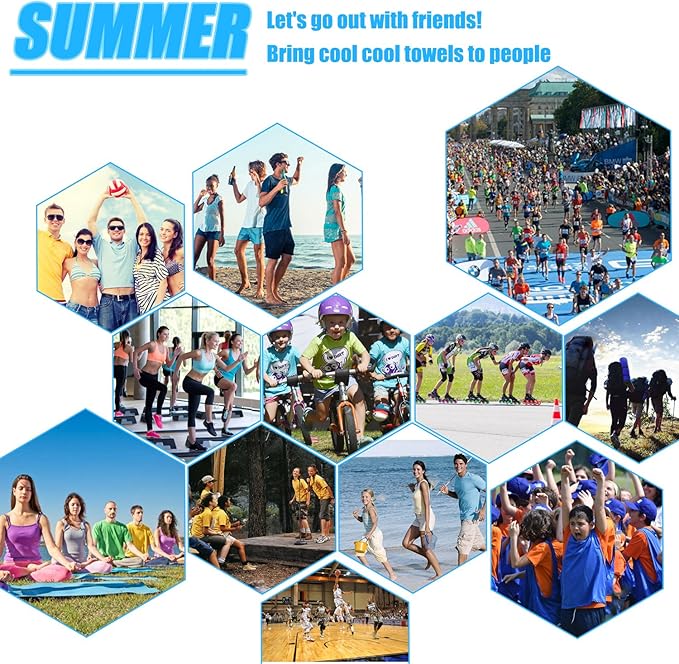 - MULTIPURPOSE SPORTS TOWEL: You may use your cooling neck wraps in many different ways! The 40''x12'' size gives you the chance to make it the perfect neck cooler, ice cooling scarf, instant heat relief bandana and cold headband. Whether you are at work, at the beach, at the gym, doing pilates at home or at camping, this cooling towel is the summer essential accessory for you.