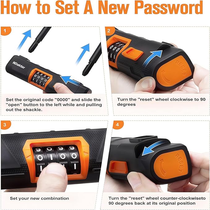 - 【Easy to Set & Use】The bike lock for electric bike has a 4-digit resettable anti-theft combo. The ebike locks for adult bikes initial code is ”0000“. When setting your new code, please first keep the digital wheel in the correct unlock password state before turning the reset disk. Turn the reset disk 90° to set a new password.(When you set a new password, please remember to jot it down or take a photo to avoid forgetting it. ).This bike lock u lock combination and steel cable works well and is beefy enough to stop casual thieves.