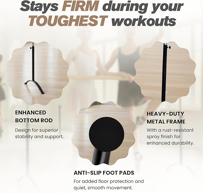 - ENHANCED STABILITY & SLIP-RESISTANT: The barre features a wide, stable base with slip-resistant rubber feet to prevent wobbling or swaying during use. Very sturdy on the floor.