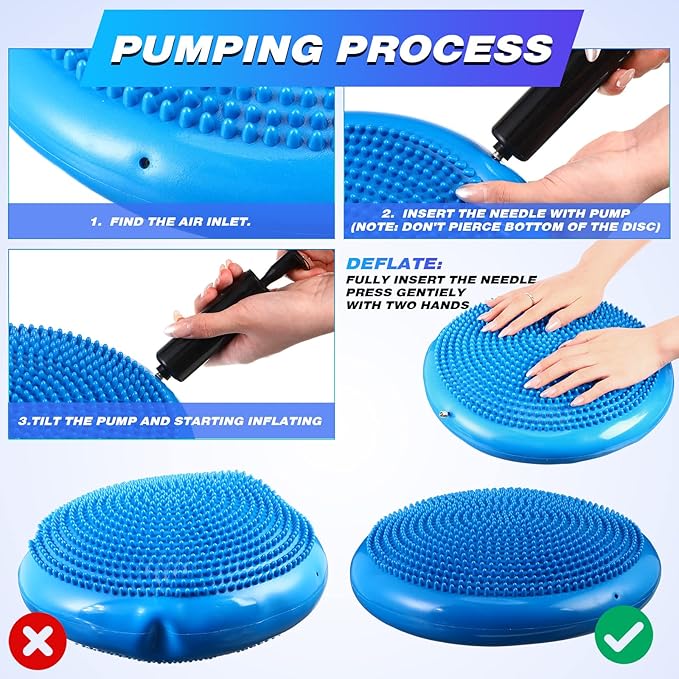 - Value Pack: this wobble cushion set includes 10 quality Inflated wobble cushion and 2 portable needle pumps; The balance disc is about 13.4 inches in diameter and can be inflated and adjusted to the ideal height and in sufficient quantity to meet daily use