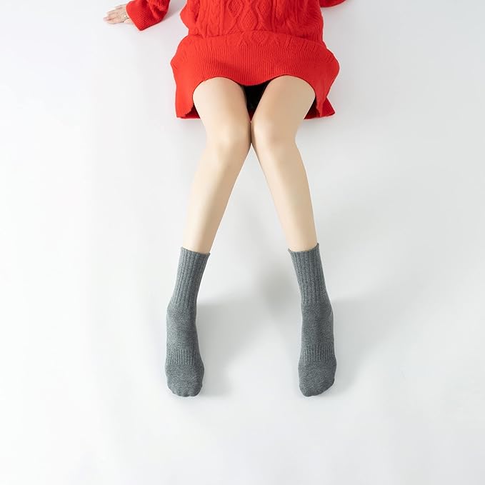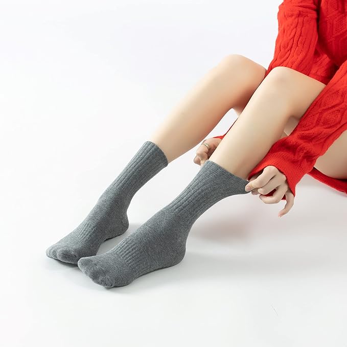 Yoga Pilates Socks with Grips for Women Non Slip Solid Colored Fleece Cushioned Mid Calf Crew Socks for Barre Ballet Dance