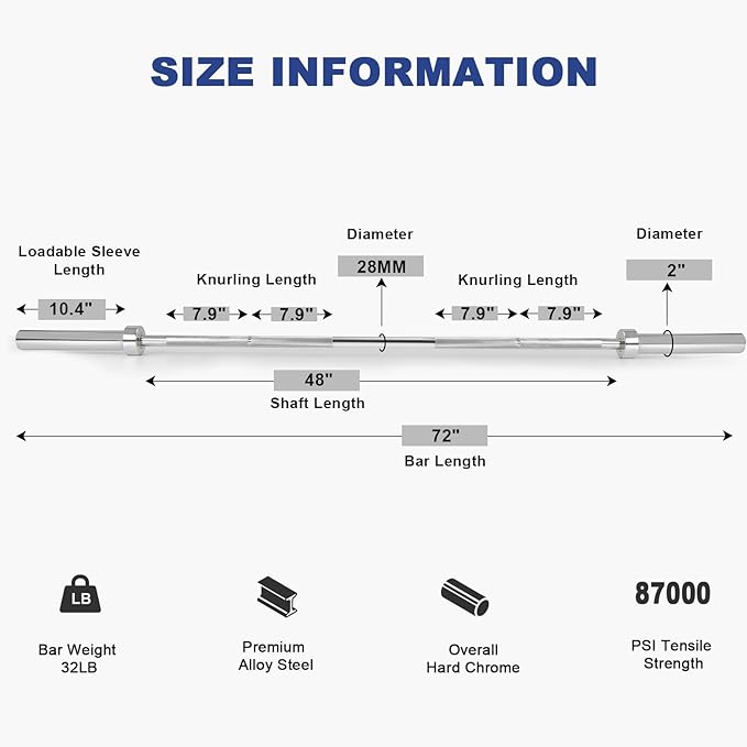 - Specifications: Full length is 72β (6ft); Weighs 32LBS; 500 pounds weight capacity; 87,000 PSI tensile strength; 28mm handgrip diameter; Single knurl mark; No center knurl. Shaft length is 48ββ; Loadable sleeves are 10.4β long and 2β in diameter to fit any Olympic weight plates.