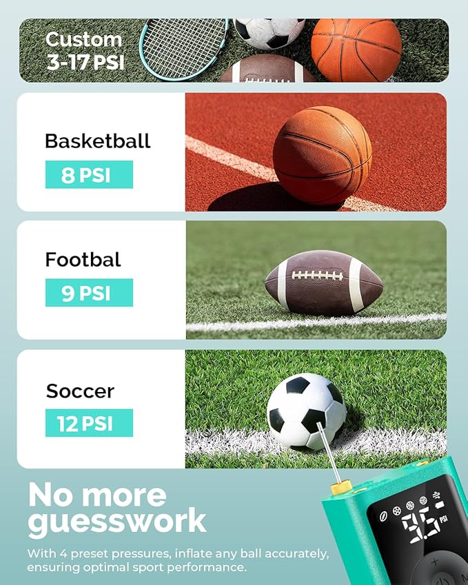 - FOUR PRESET INFLATION MODES: The ETENWOLF ball pump has footballs, basketballs, soccer balls, and a custom mode for inflating any balls from 2 to 17 PSI. It also has a shut-down memory function that saves your last pressure setting for quick and easy use