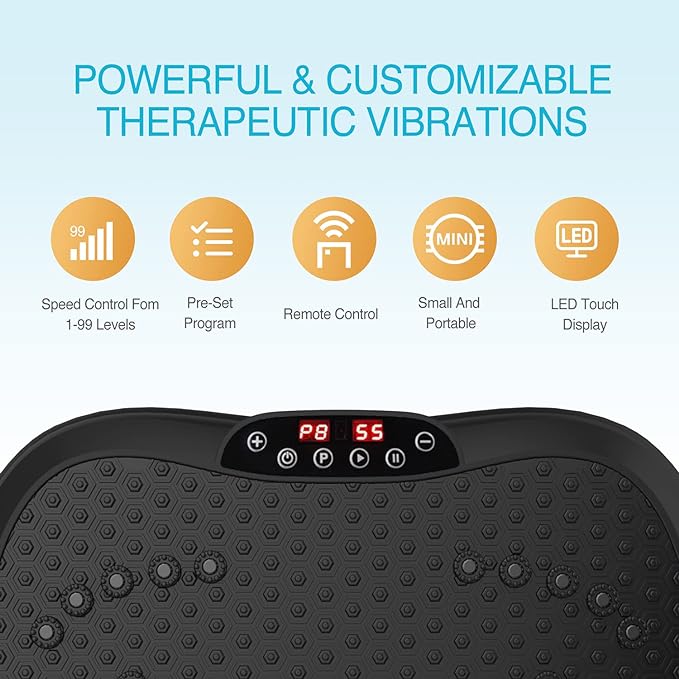 - ✅RICH FUNCTIONAL & HIGH EFFICIENT& REMOTE CONTROL: Adjustable vibration speed (1 to 99), with 2 resistance workout bands, can exercise upper body and lower body at the same time. Offering variety of exercise modes, allow you to try different vibration exercises, With this workout machine, you can have your routine exercise done in only 10 minutes everyday. What you’ll get is a better shape and enhanced metabolism, increased bone mineral density, relieve and reduce stress levels.