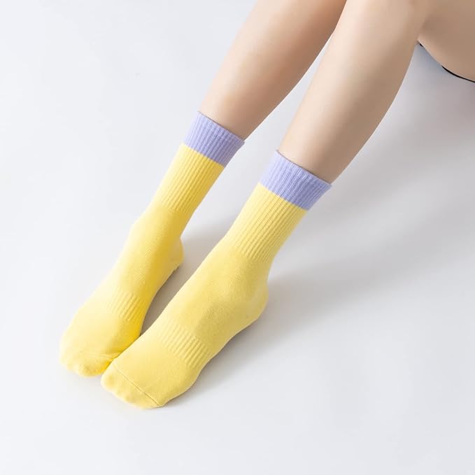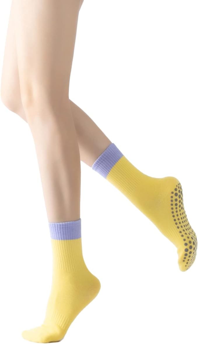 Yoga Pilates Socks with Grips for Women Non Slip Color Blocking Cushioned Crew Socks for Barre Ballet Dance