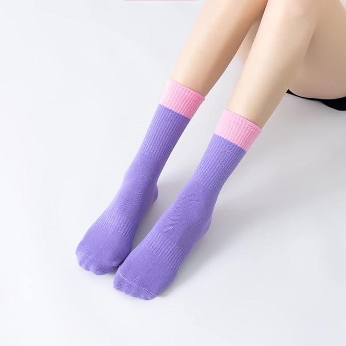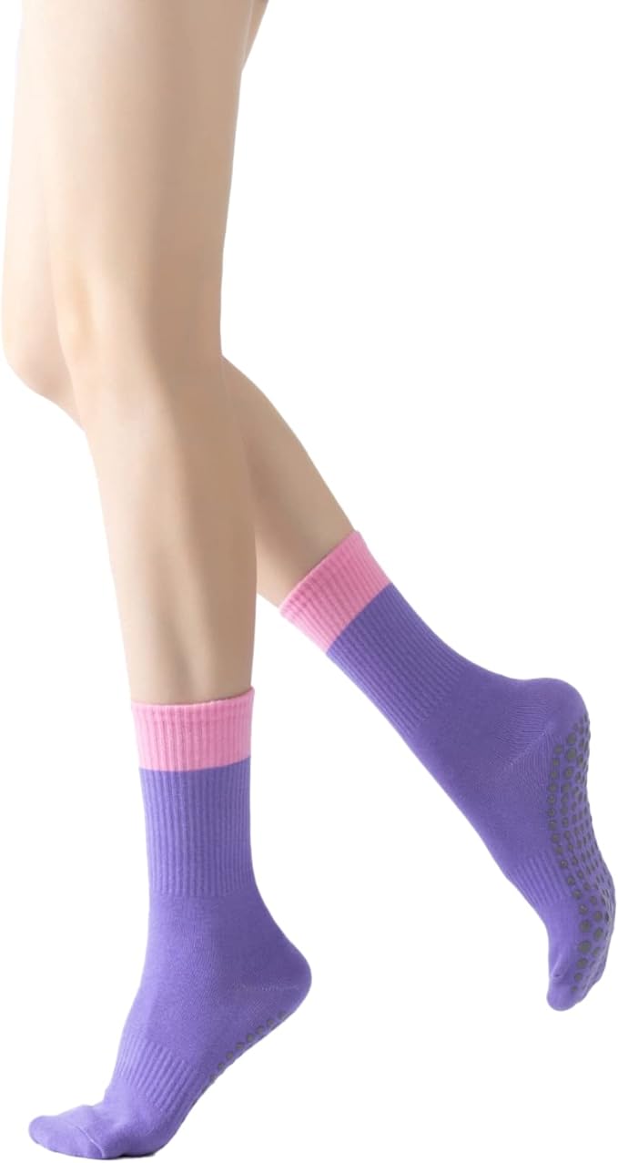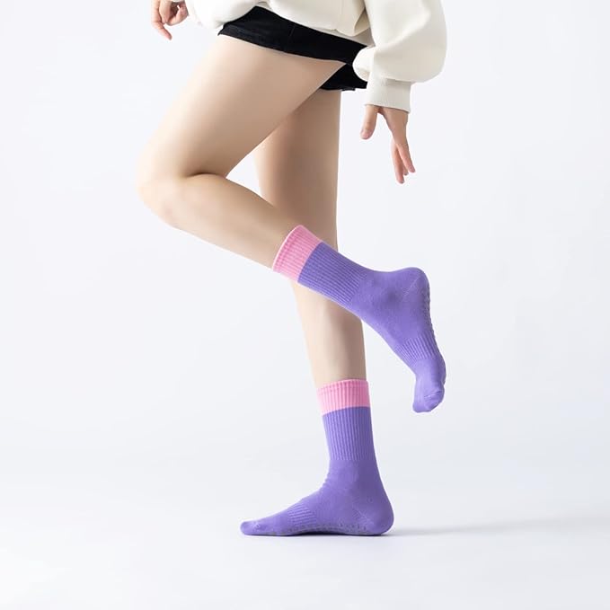 Yoga Pilates Socks with Grips for Women Non Slip Color Blocking Cushioned Crew Socks for Barre Ballet Dance