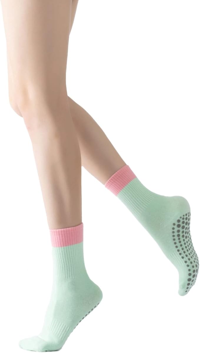 Yoga Pilates Socks with Grips for Women Non Slip Color Blocking Cushioned Crew Socks for Barre Ballet Dance