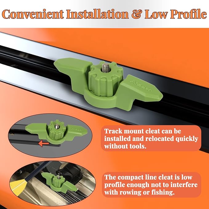 - Track mount cleat can be installed and relocated quickly without tools. It can be moved on the rail directly and mounted to the required position without drilling holes on the kayak. The compact line cleat is low profile enough not to interfere with rowing or fishing