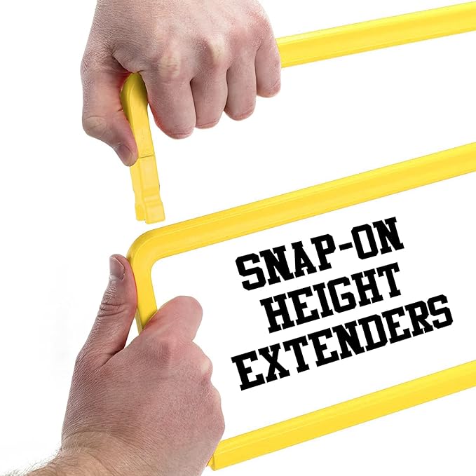 • SNAP ON EXTENDERS: Increase workout intensity levels with two height extenders per hurdle, snap on and adjust hurdles to heights of 6", 9.25", 11.75", and 15". Each hurdle is a standard size of 18inch wide.