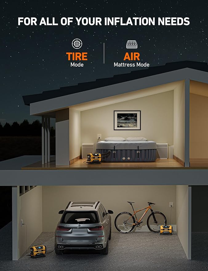 - Fast Inflation & 15-Minute Continuous Work: With dual metal motors and a metal cylinder, the tire inflator can continuously work for up to 15 mins. Large-volume mode provides a maximum inflation rate of 350 L/min, quickly inflating large items. High-pressure mode pumps up to 150 PSI, inflating a flat tire from 0 PSI to 36 PSI in 6 minutes. Compatible with cars, bikes, sedans and mid-sized SUVs. NOTE: This pump is incompatible with heavy-duty trucks. Please let the pump cool for at least 10 minutes after every 15 minutes of use