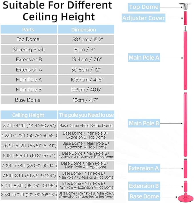 - 【Fixed Plate Safer & Sturdy】Our fixed plate dance poles are safe for home studio use and fit ceilings from 7.3 to 9 feet with a diameter of 45mm. The package includes 2 extension poles and a height adjuster, but be sure to measure your ceiling height and choose the right pole size. If your ceiling is over 9 feet, we have 4 extension sizes available for individual purchase.