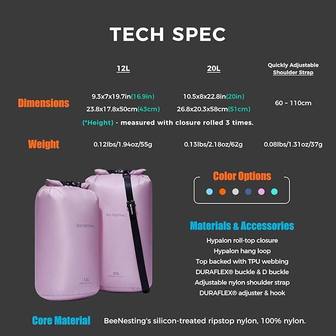- 117g Truly Ultralight - Ultralight Dry Bag Large Set includs 12L, 20L and quick-adjust nylon shoulder strap, Lightweight materials keep the total sacks weight is only 117g(0.25lb), Comfortable and easy to carry.