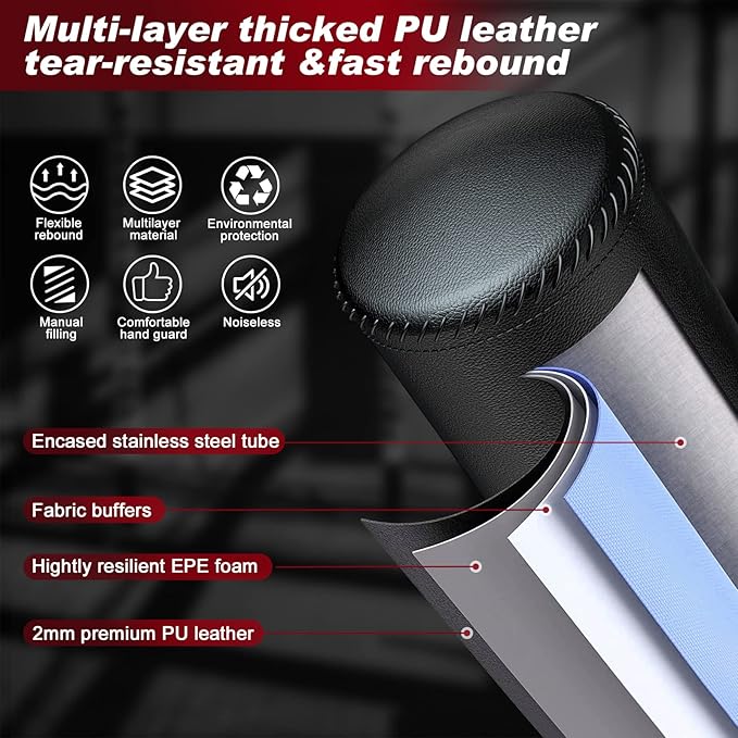 - Premium Materials - The stainless steel tube uses a multi-layer protective structure, 2mm thickened PU leather striking surfaces, it is tear resistance. The highly resilient EPE foam and fabric buffers reduce recoil and protect your hand.