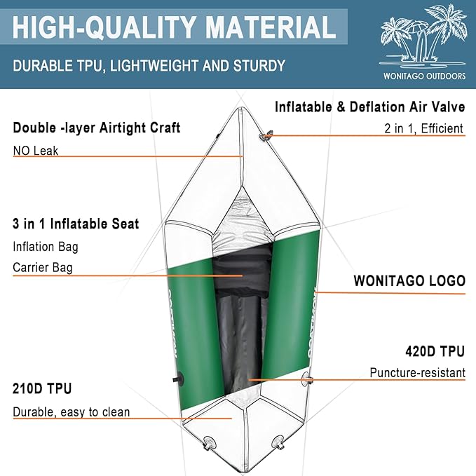 - High-Quality TPU Packraft --- Both sides are made of durable 210D TPU, and the bottom is made of upgraded 420D TPU, lightweight and sturdy, better performance than PVC kayaks. Dual-layer Airtight Process, leakproof. With this durable material, you can be confident that our packrafts will last for many adventures to come