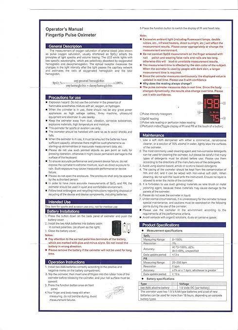 - What You Get: 1* finger pulse oximeter, 1* lanyard, 2*AAA batteries. Note: this device is only used for sports and aviation purposes, not intended for medical purposes .