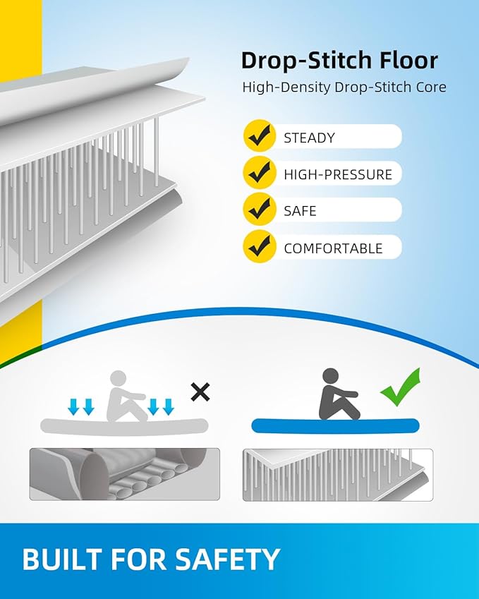 - 【Enjoy Comfort】Drop-stitch floor could provide more rigidty and support than I-beam floor, and the surface will be flatter for you to sit. Padded EVA seat provides superior back support, footrest ensures a relaxed sitting position. Drain hole will drain out excess water timely. Always keep you in comfort.