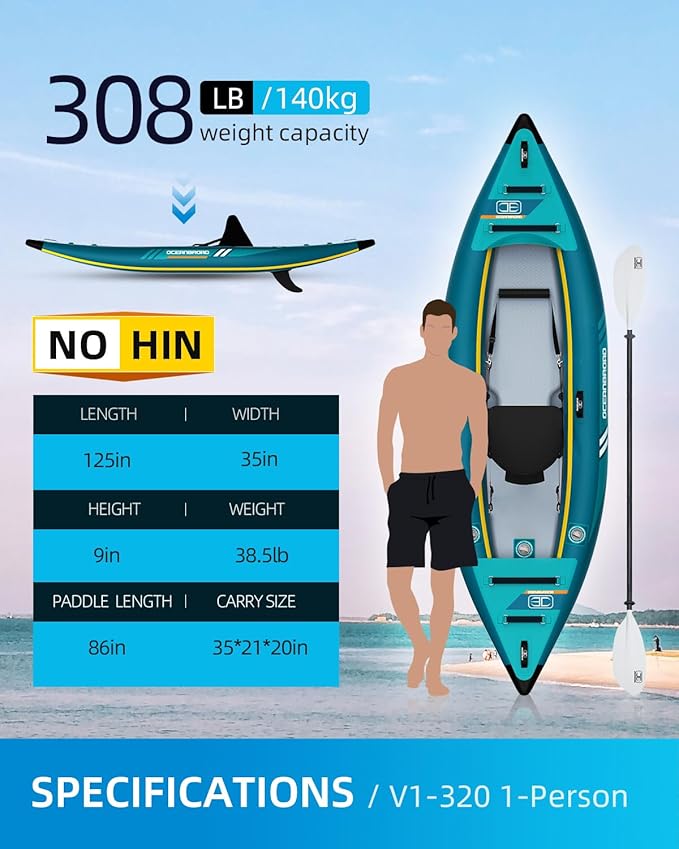 - 【V320 1-PERSON】Inflated size is 10.5 x 2.95 x 0.79 feet with a weight capacity of 308 pounds and easily foldable to be put in the carry bag that allows for easy transportation. Made of heavy duty vinyl, the kayak will be with you longer.