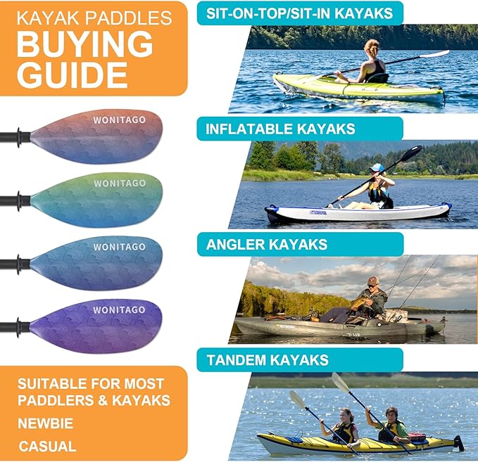 - WHY CHOOSE WONITAGO --- Our kayak oars reduce fatigue and maximize performance, allowing you to paddle for longer without discomfort. So, whether you're exploring the coast, racing down a river, or enjoying a peaceful lake, our kayak paddles are the perfect choice for your next adventure