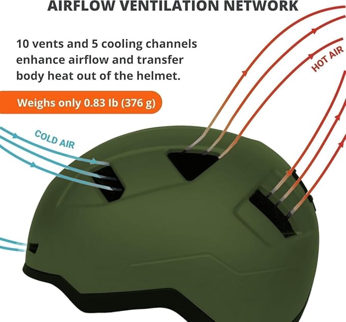 - STYLISH DESIGN: The helmet has a stylish urban look. The aerodynamic design contains 10 vents on the front and on the crest of the helmet that actively capture airflow and pass it through the interior cooling channels for better ventilation. In-mold construction weighs less than a pound (0.83 lbs), which helps reduce sweating and heat during long rides. The detachable fabric visor protects the eyes from the sun.
