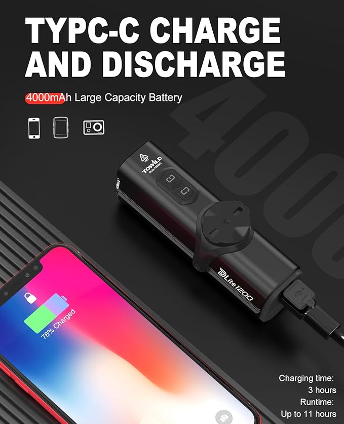 - Endurance and Efficiency: Designed to cater to the needs of accomplished cyclists,the DL1200 bike light features a high-capacity 4000mAh rechargeable battery. Powered by convenient TYPE-C charging, this exceptional bike light delivers an impressive runtime of up to 18 hours in super high mode. It guarantees long-lasting performance during extensive rides, providing peace of mind for the ambitious cyclist