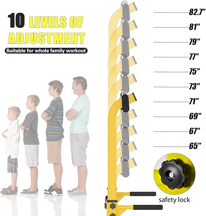 - 10 Levels Height Adjustment: Measuring 32.3Lx29.5Wx65~82.7H (inches) and supporting a weight capacity of 330LBS, this pull up bar is an ideal fitness tool for adults in their homes or offices. The height of the pull up tower can be adjusted from 58.5~82.7", making it suitable for all fitness needs. And the lowest level is tailored for kids, while the pull up bar station caters to the entire family's workout needs.