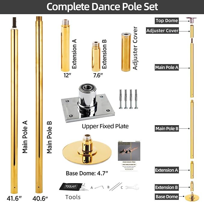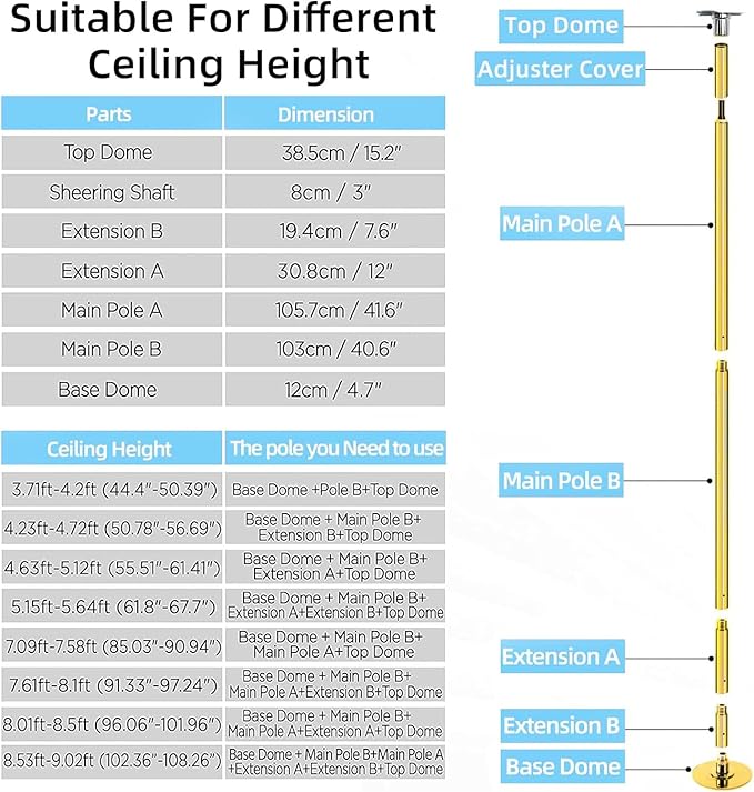 - 【SAFER AND EASIER】Our fixed plate dance poles are safe for home studio use and fit ceilings from 7.3 to 9 feet with a diameter of 45mm. The package includes 2 extension poles and a height adjuster, but be sure to measure your ceiling height and choose the right pole size. If your ceiling is over 9 feet, we have 4 extension sizes available for individual purchase.