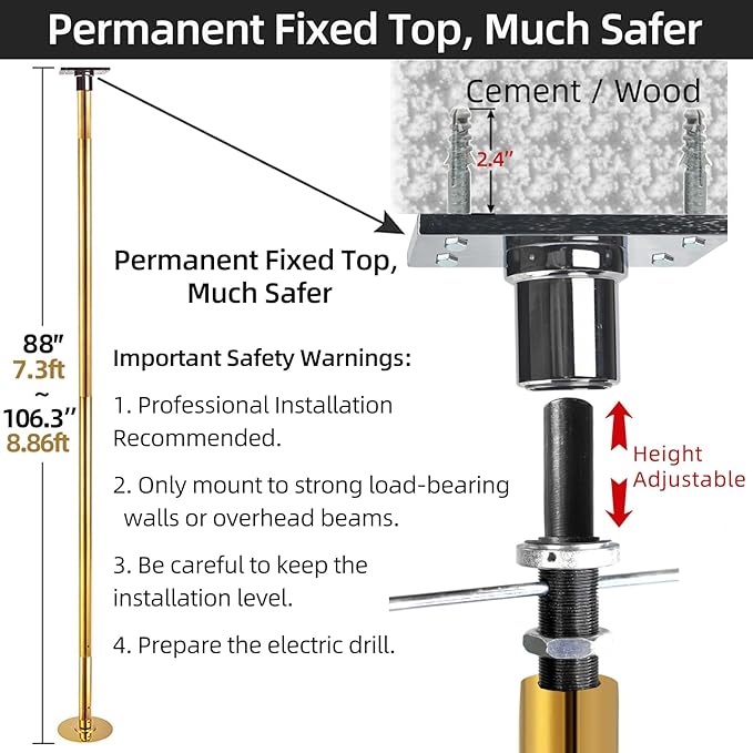 - 【INSTALLATION INSTRUCTIONS】 Prepare the installation area. Before you start installing your pole, make sure you have enough clearance around it, a stable surface to stand on, and the necessary tools and hardware. You will need a drill, screws, anchors, level, tape measure and, if you have high ceilings, a ladder or stool. It is also recommended to clean the area and remove any obstacles or hazards that may interfere with your dancing.