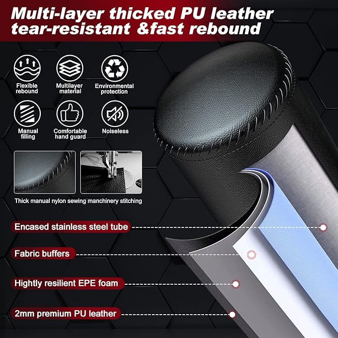 - šš«šš¦š¢š®š¦ ššššš«š¢šš„š¬ - The stainless steel tube uses a multi-layer protective structure, 2mm thickened PU leather striking surfaces, it is tear resistance. The highly resilient EPE foam and fabric buffers reduce recoil and protect your hand.