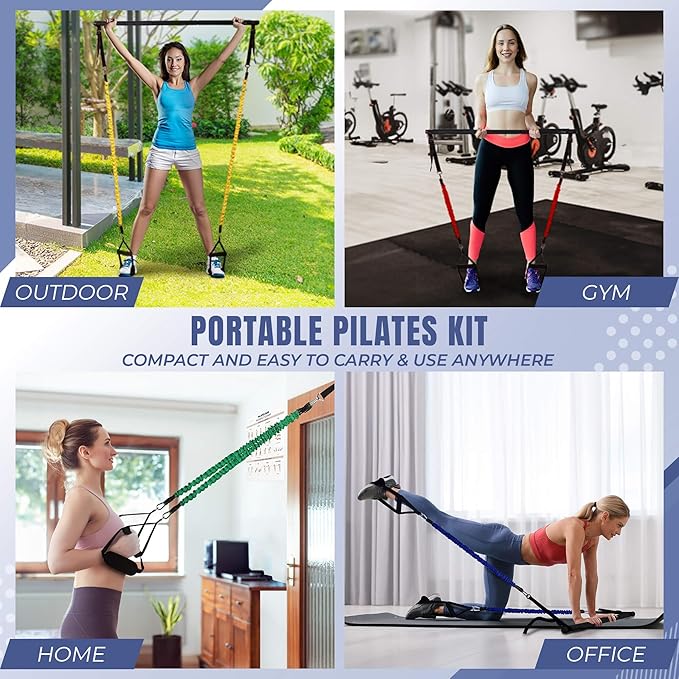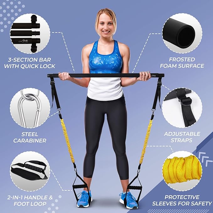 - Pilates Bar Kit: Our multi functional pilates bar is a home fitness equipment package designed to diversify your pilates workouts. This workout set includes a pilates bar, adjustable resistance bands, a door anchor, handles with wider foot loop, and a workout chart.