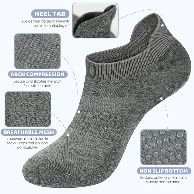 - 【SPECIAL DESIGN】 Grippy socks for women and men are designed with arch compression elastic band, the right amount of arch compression makes the arch safe and stable, perfect fit, safe and reliable protection of the arch of the foot; through a certain degree of deformation, it can be suitable for different foot shapes. Breathable mesh allows air to circulate through the sock, keeping feet dry and comfortable.