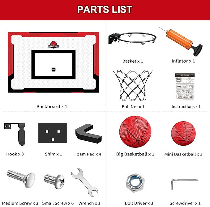 - [Perfect Gifts for Adults and Kids]- Indoor basketball hoop set is a great birthday, Christmas, Thanksgiving, Halloween, New Year gift for basketball fans of all ages. Over the Door Basketball Hoop turns any bedroom or office into a center court, ready to provide you with a fun basketball game!