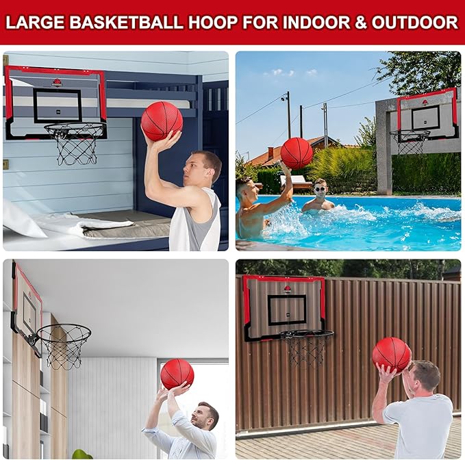 - [Upgraded Large Basketball Hoop]- Our backboard size is 24" x 16" and the basketball toy set comes with large and small basketballs for both adults and kids. Adults can enjoy shooting baskets and relieve stress during breaks. Larger sized basketball hoops provide a better dunking experience.