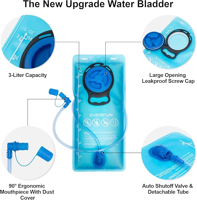- EFFICIENT HYDRATION SYSTEM: This 18L hydration backpack includes an UPGRADED 100 oz / 3-LITER water bladder made of FOOD-GRADE PEVA material. The water Pouch has a Large Opening for easy refilling with water, ice cubes and cleaning. The high-flow bite valve is ergonomically designed for more comfortable use. The mouthpiece cover protects the bite valve against dirt and damage.