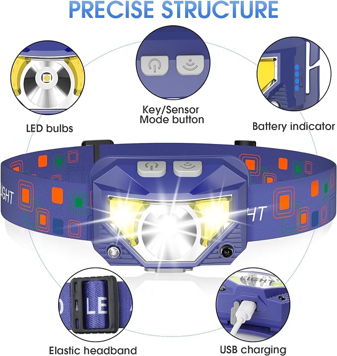 - Waterproof and 8 Modes: The headlight has IPX4 waterproof rate. The high-quality shell is more sealed and leak-proof, which is suitable for rain or snow, indoors or outdoors. The led headlamp has 8 lighting modes to meet your various needs. In key light mode, you can switch the main strong beam, main weak beam, side strong beam, side weak beam, red beam, SOS red strobe. In motion sensor mode, you can switch the main strong beam and side strong beam