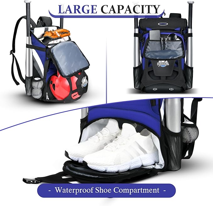 Baseball Backpack for Adult and Youth, Large Capacity Lightweight Softball Bag With Shoe Compartment and Fence Hook for TBall Bat & Equipment, Waterproof for Helmet, Gloves