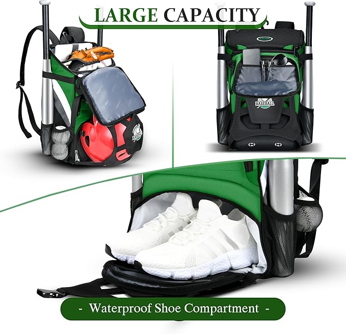 - WATER RESISTANT SHOE COMPARTMENT: BAGNN baseball bag designed with large shoe comapartment that help separete your baseball shoes from other equipment and gear, the ventilated hole keep your shoes dry and breathable