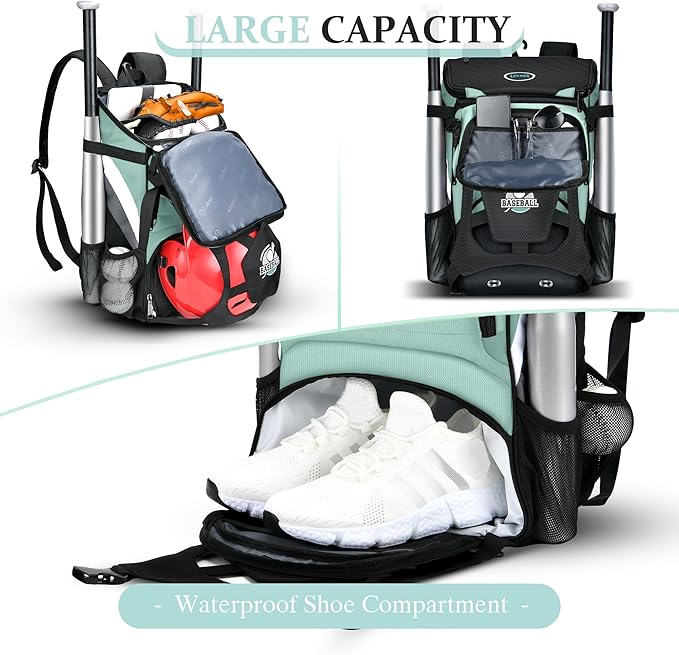 - WATER RESISTANT SHOE COMPARTMENT: BAGNN baseball bag designed with large shoe comapartment that help separete your baseball shoes from other equipment and gear, the ventilated hole keep your shoes dry and breathable