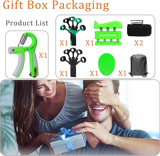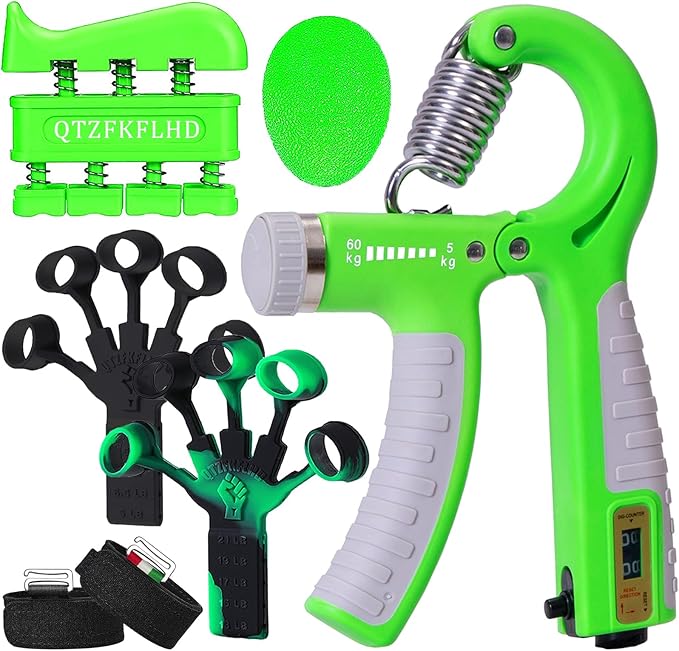 - Hand Grip Strengthener Workout Kits : The grip trainer set includes an adjustable forearm gripper, 10 levels of forearm strengthener, finger exerciser and squeeze stress ball. Alternating the use of these items can fully exercise the strength and flexibility of the fingers, hands, and forearms.