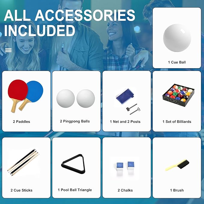 - Complete Accessories: The pool table set comes with all the accessories you need --including a set of billiard balls, two cue sticks, a billiard brush, a ball triangle, two pieces of chalk, a table tennis table top, two paddles, and 2 table tennis balls, net and post set.