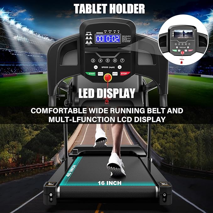 - Large Running Area & LCD Display – Spacious 41.3" x 15" running belt (treadmill 400 lb capacity) with a real-time LCD tracking speed, distance, calories, time, and pulse. Includes a phone/water bottle holder.