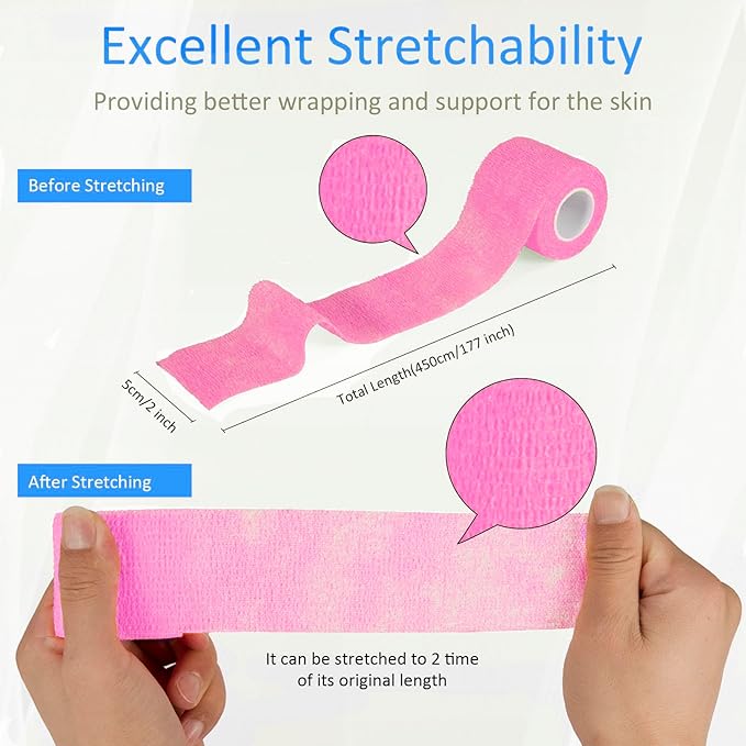 - 【Self Adhesive & Elastic Bandage】The self-adherent cohesive wrap bandage will stick to itself without adhere to the skin, making bandage removal easy and painless. Good stretch elasticity provide adjustable support and compression that stabilizes the wrapped joint.
