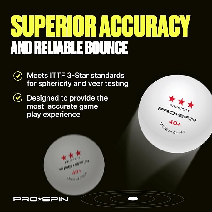- ELITE PERFORMANCE 3-STAR PING PONG BALLS – Introducing PRO-SPIN Sports Elite Series 3-star table tennis balls, the ultimate upgrade for competitive players. Designed to meet strict 3-Star premium 40 table tennis ball standards, they deliver precision bounce, clean spin, and powerful performance.