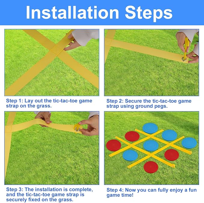 - Easy Installation: Simply place the large tic-tac-toe nylon strips on the ground and secure them with the included ground stakes. No tools are required and installation takes just seconds.
