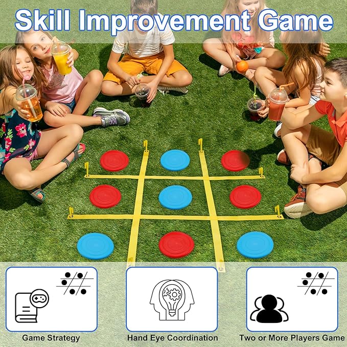 - Package Contents: Your purchase includes a complete giant lawn games set including a foldable 4 x 4 feet large nylon tic-tac-toe belt,8 ground pegs for fixing, and 10 classic red and blue soft flying discs.