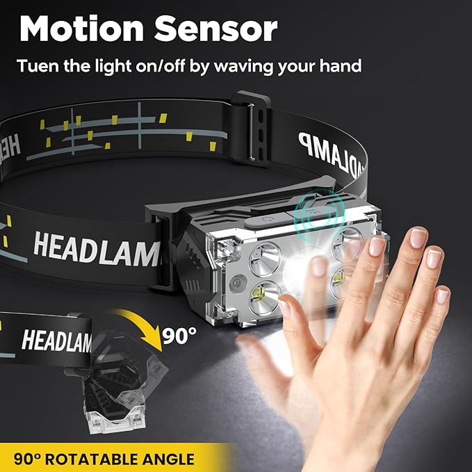 - ✨【Multiple light modes and intelligent sensors】The light has 6 lighting modes, including white light (super bright, high, medium, low, flashing) and red light (steady & flashing). Headlamp has a motion sensor mode that allows you to turn the lights on or off simply by waving your hand.