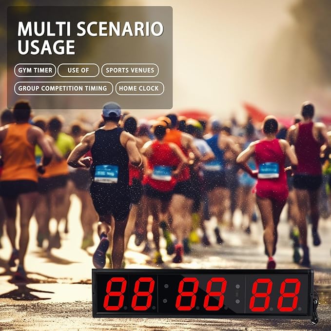 - 【Enlarged size】: 4.0 inch interval timer, size 33.07 * 10.24 * 4.92. Equipped with an independent reinforcement bracket, the height of the bracket can be adjusted up to 170CM and can bear 11 pounds. This design makes the fitness timer more suitable for medium to large sports events. The 4.0-inch 6-digit ultra bright all red LED numbers can clearly see the time display from a long distance, and the LED digital brightness supports 5 levels of adjustment. The built-in buzzer can prompt you to start training, and the sound can be turned on/off through the remote control