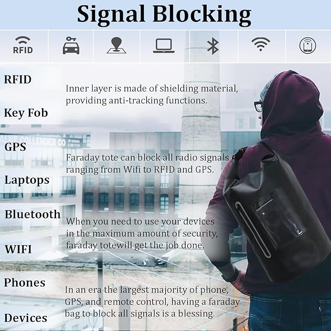 - 💯【15L Capacity & Transparent Pocket】Package includes: faraday bag (16.5’’ x 9’’). The waterproof bag can hold your laptops, tablets, devices, and a few outfits. And the surface of faraday bags has a transparent zipper pocket where you can store your keys, wallet, and credit cards.