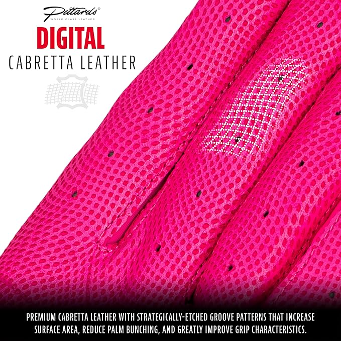 - DIGITAL CABRETTA LEATHER: Premium cabretta leather with strategically-etched groove patterns that increase surface area, reduce palm bunching, and greatly improve grip characteristics