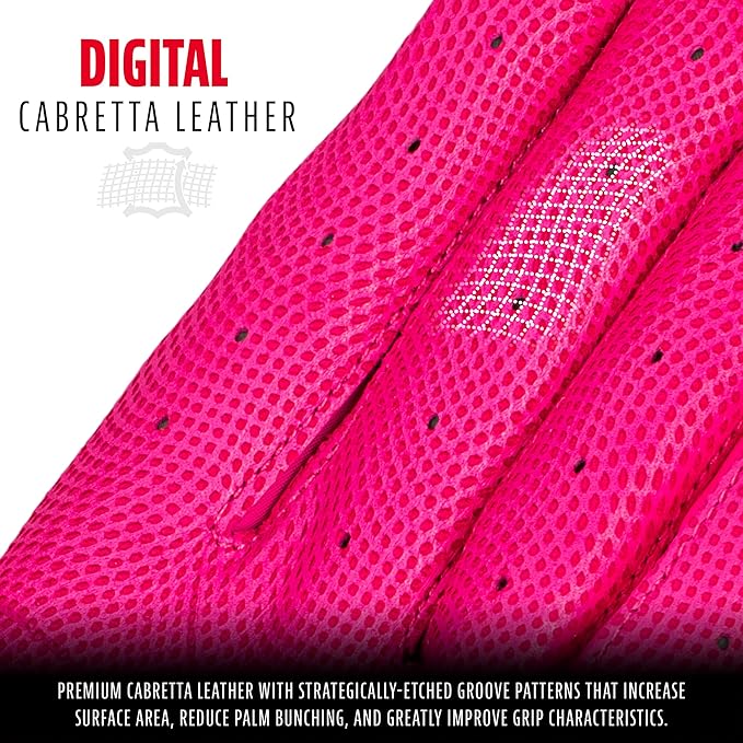 - DIGITAL CABRETTA LEATHER: Premium cabretta leather with strategically-etched groove patterns that increase surface area, reduce palm bunching, and greatly improve grip characteristics